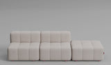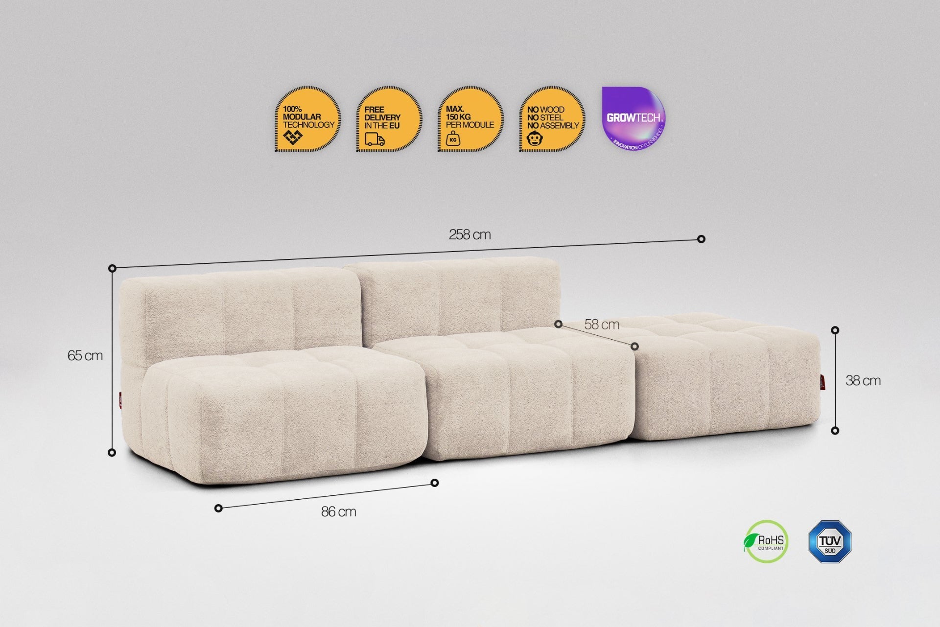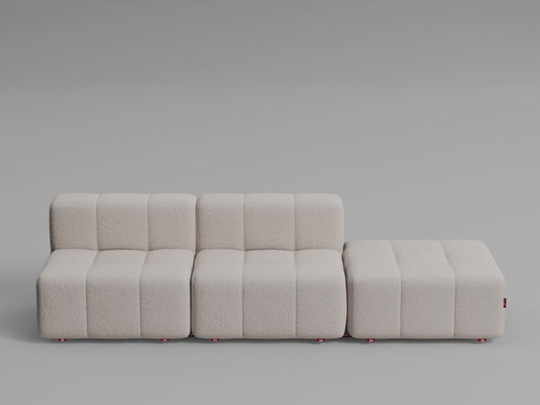 Taburet, středový a rohový díl lze jednoduše postavit vedle sebe – není potřeba žádné upevnění, pohovka díky své váze a konstrukci zůstává stabilně pohromadě.