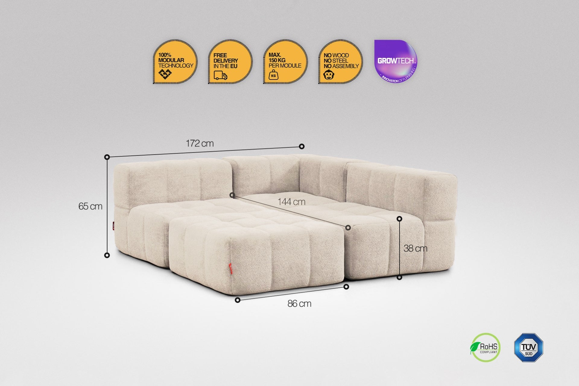 Moduly lze jednoduše propojit, takže drží stabilně vedle sebe – žádné rozjíždění, jen pevné pohodlí.