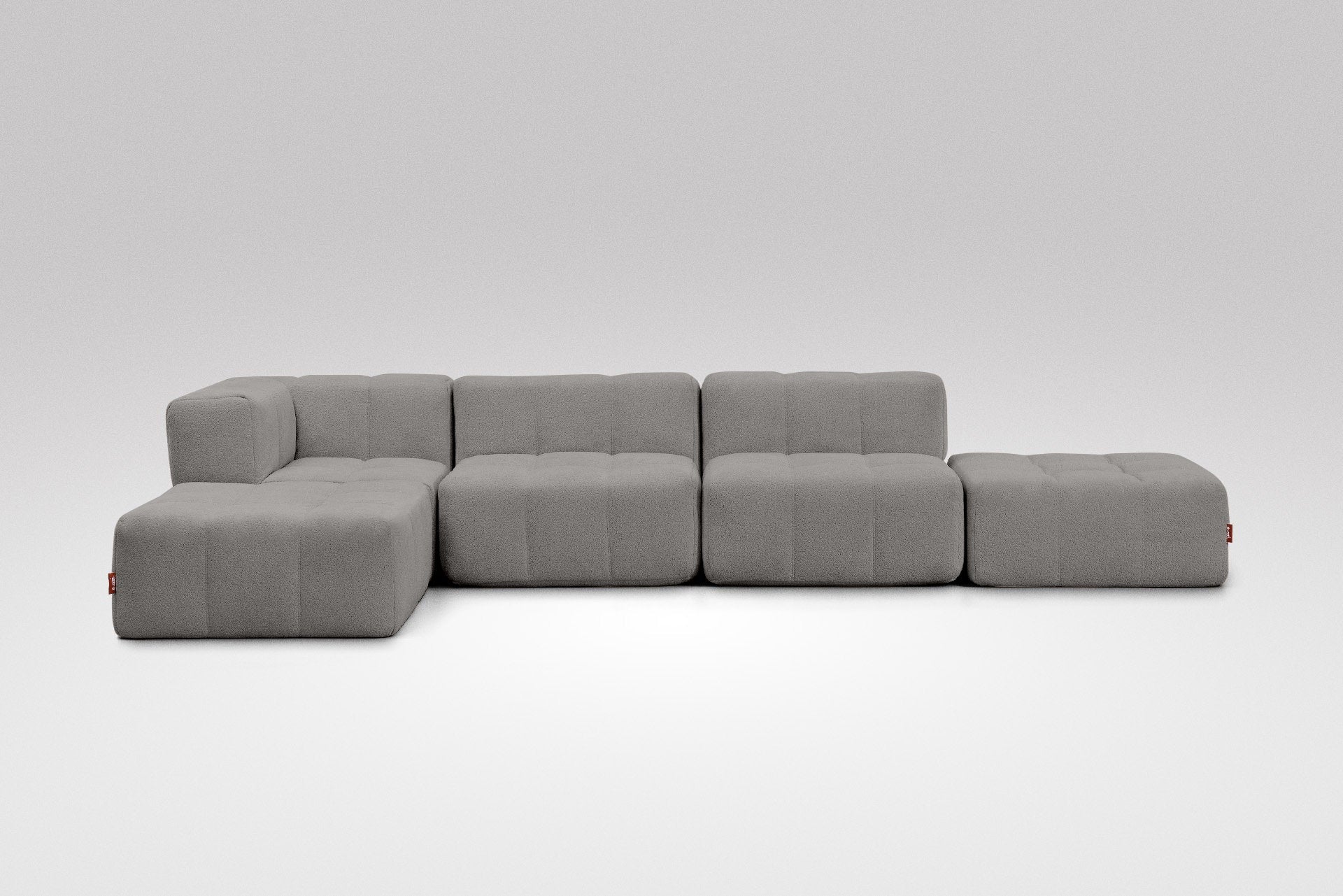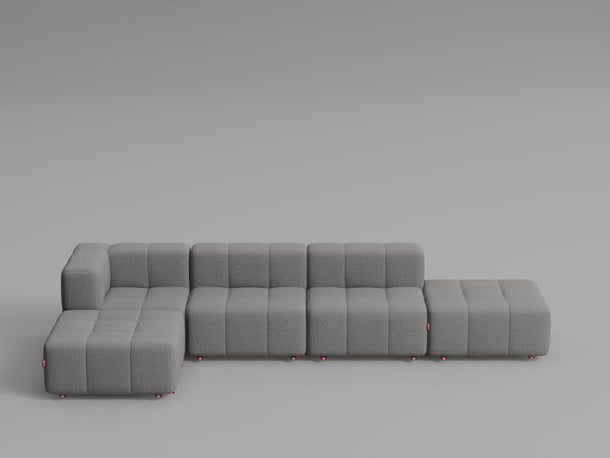 Taburet, středový a rohový díl lze jednoduše postavit vedle sebe – není potřeba žádné upevnění, pohovka díky své váze a konstrukci zůstává stabilně pohromadě.