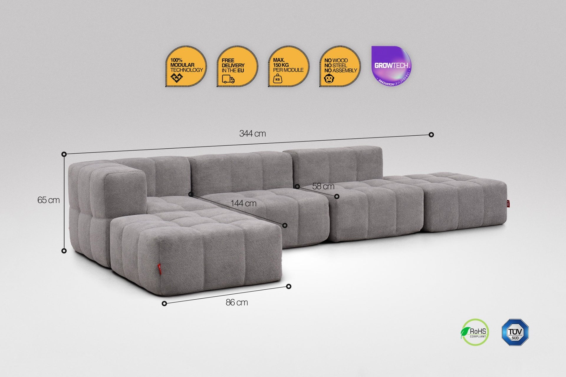 Moduly lze jednoduše propojit, takže drží stabilně vedle sebe – žádné rozjíždění, jen pevné pohodlí.