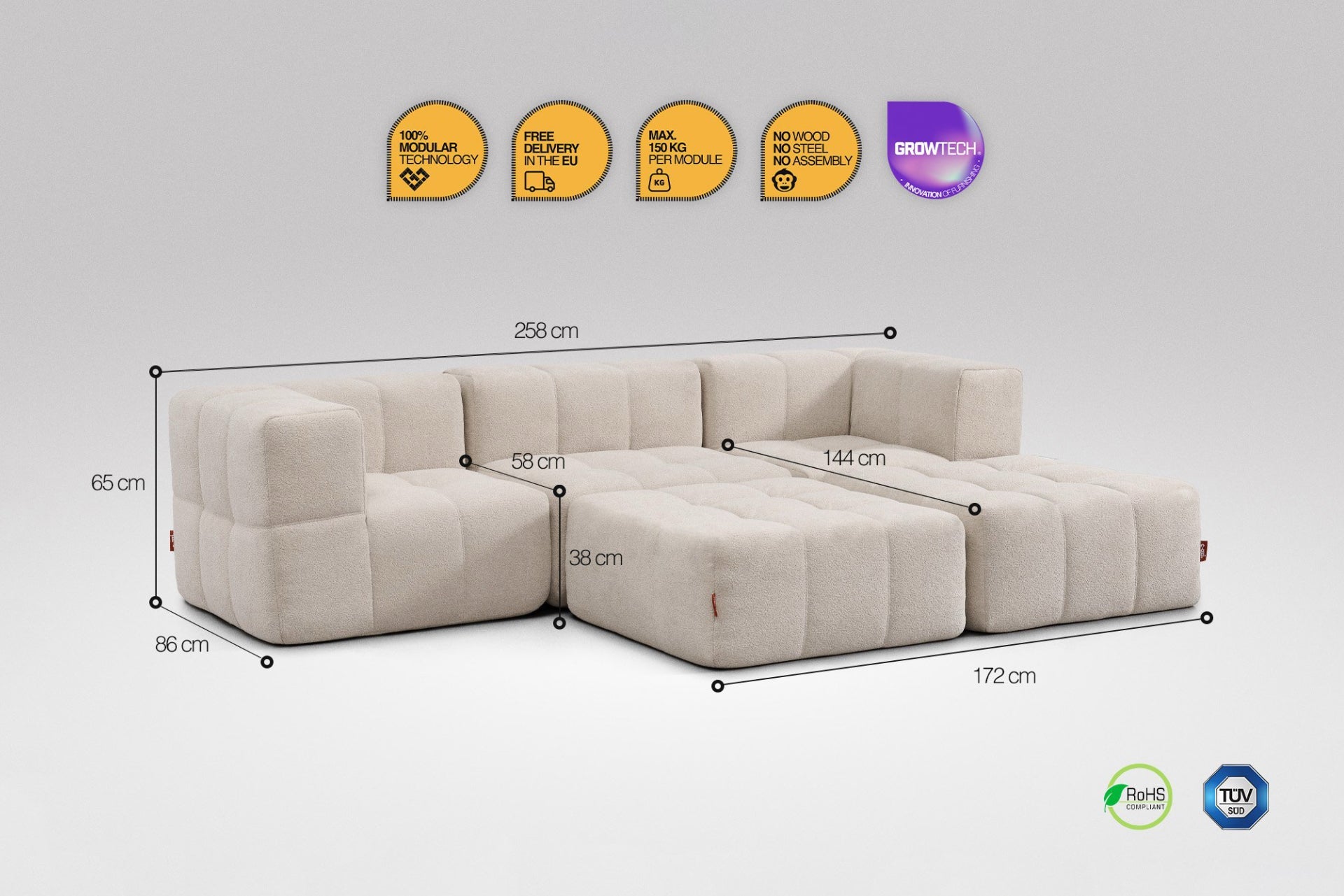 Moduly lze jednoduše propojit, takže drží stabilně vedle sebe – žádné rozjíždění, jen pevné pohodlí.