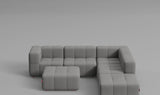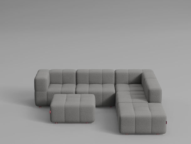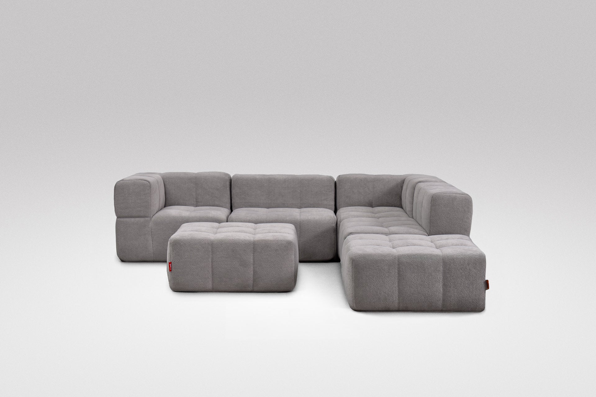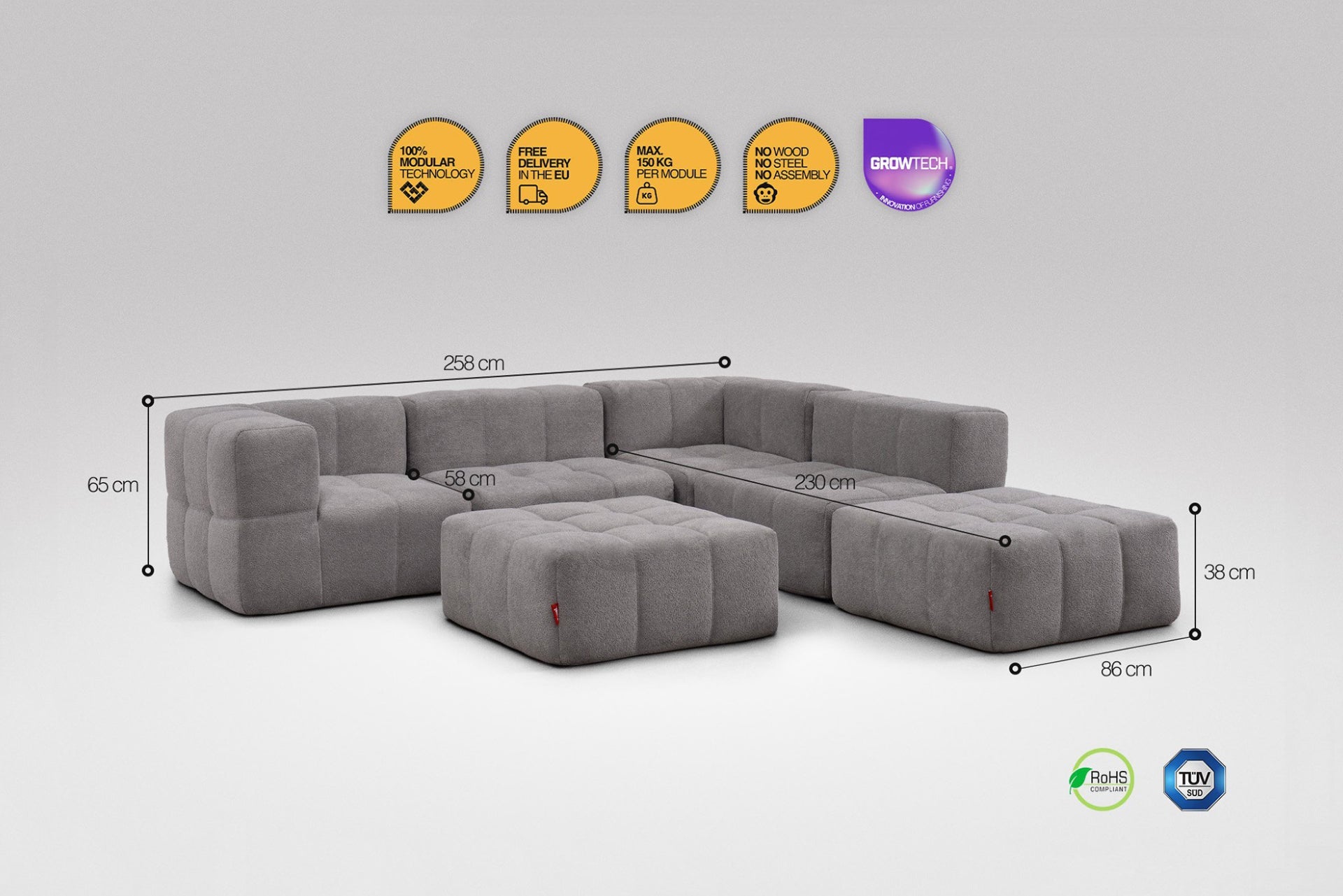 Taburet, středový a rohový díl lze jednoduše postavit vedle sebe – není potřeba žádné upevnění, pohovka díky své váze a konstrukci zůstává stabilně pohromadě.