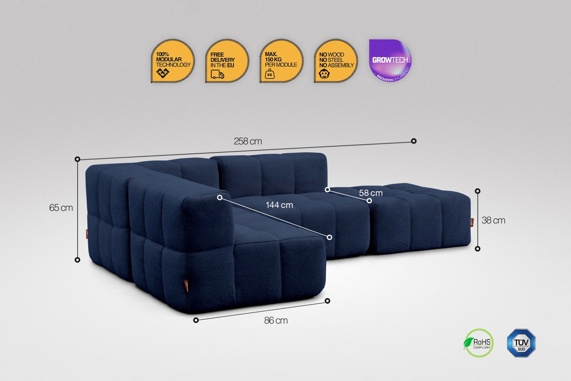 A modulok egyszerűen összekapcsolhatók, így stabilan tartanak egymás mellett – nincs szétcsúszás, csak masszív kényelem. Csúszásgátló felületük és ideális súlyuk gondoskodik róla, hogy a kanapé a helyén maradjon, mégis könnyedén átrendezhesd, ha új hangulatra vágysz.
