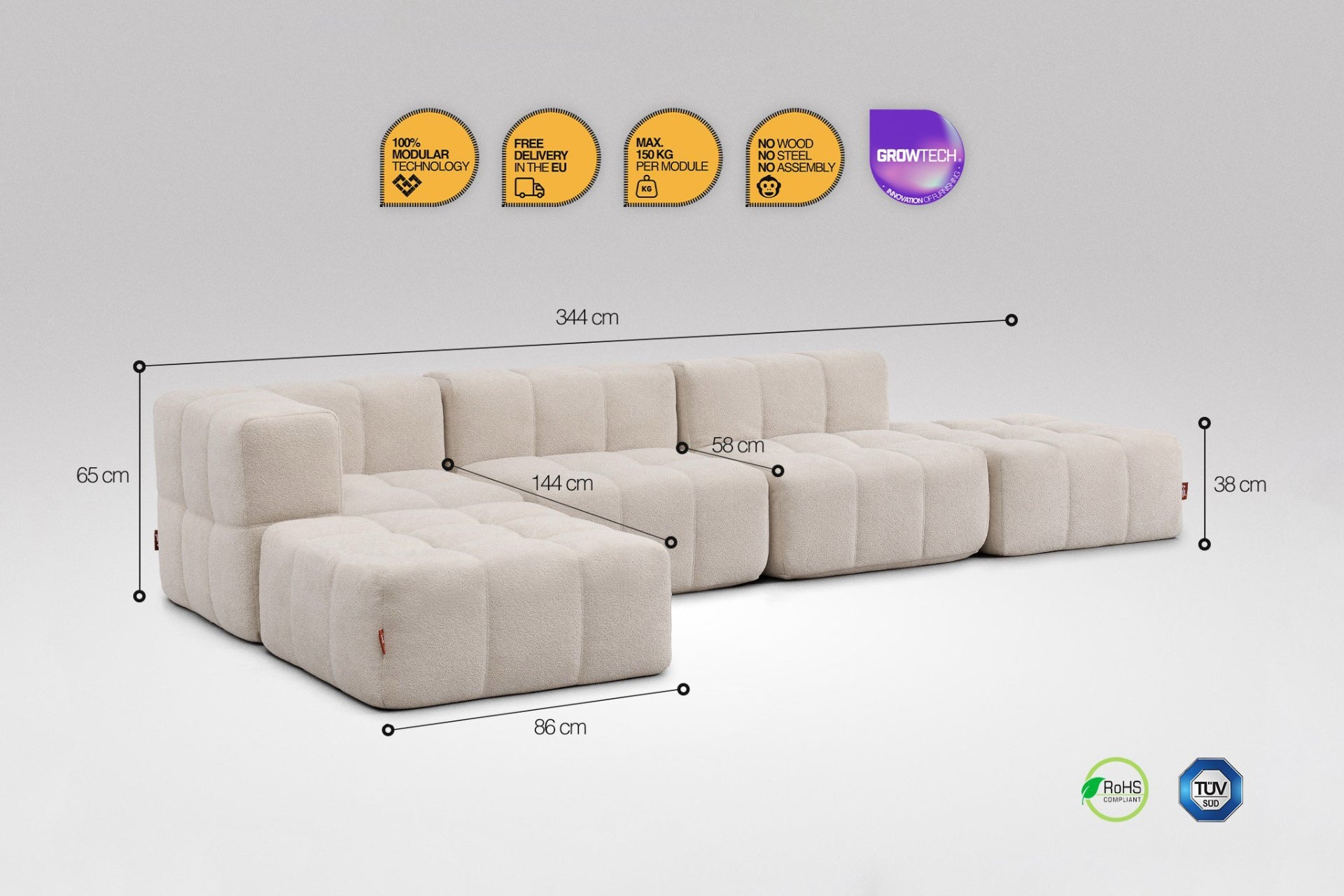 A modulok egyszerűen összekapcsolhatók, így stabilan tartanak egymás mellett – nincs szétcsúszás, csak masszív kényelem. Csúszásgátló felületük és ideális súlyuk gondoskodik róla, hogy a kanapé a helyén maradjon, mégis könnyedén átrendezhesd, ha új hangulatra vágysz.