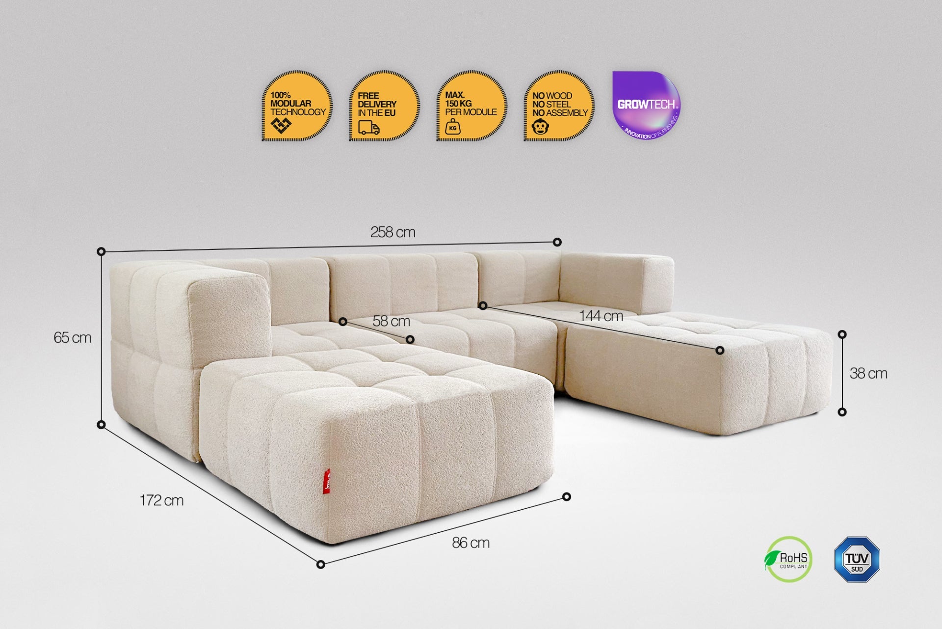 A modulok egyszerűen összekapcsolhatók, így stabilan tartanak egymás mellett – nincs szétcsúszás, csak masszív kényelem. Csúszásgátló felületük és ideális súlyuk gondoskodik róla, hogy a kanapé a helyén maradjon, mégis könnyedén átrendezhesd, ha új hangulatra vágysz.