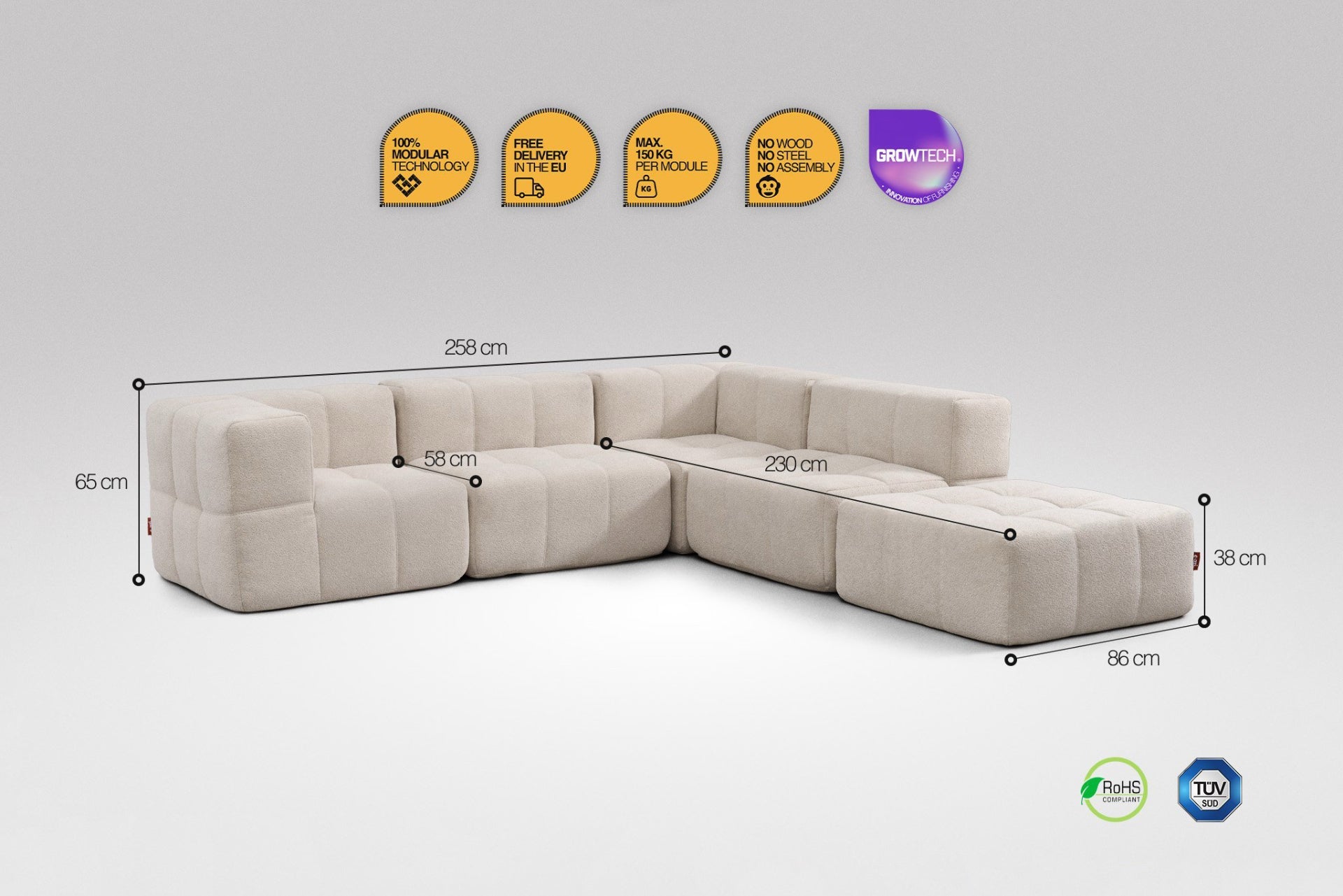 A modulok egyszerűen összekapcsolhatók, így stabilan tartanak egymás mellett – nincs szétcsúszás, csak masszív kényelem. Csúszásgátló felületük és ideális súlyuk gondoskodik róla, hogy a kanapé a helyén maradjon, mégis könnyedén átrendezhesd, ha új hangulatra vágysz.