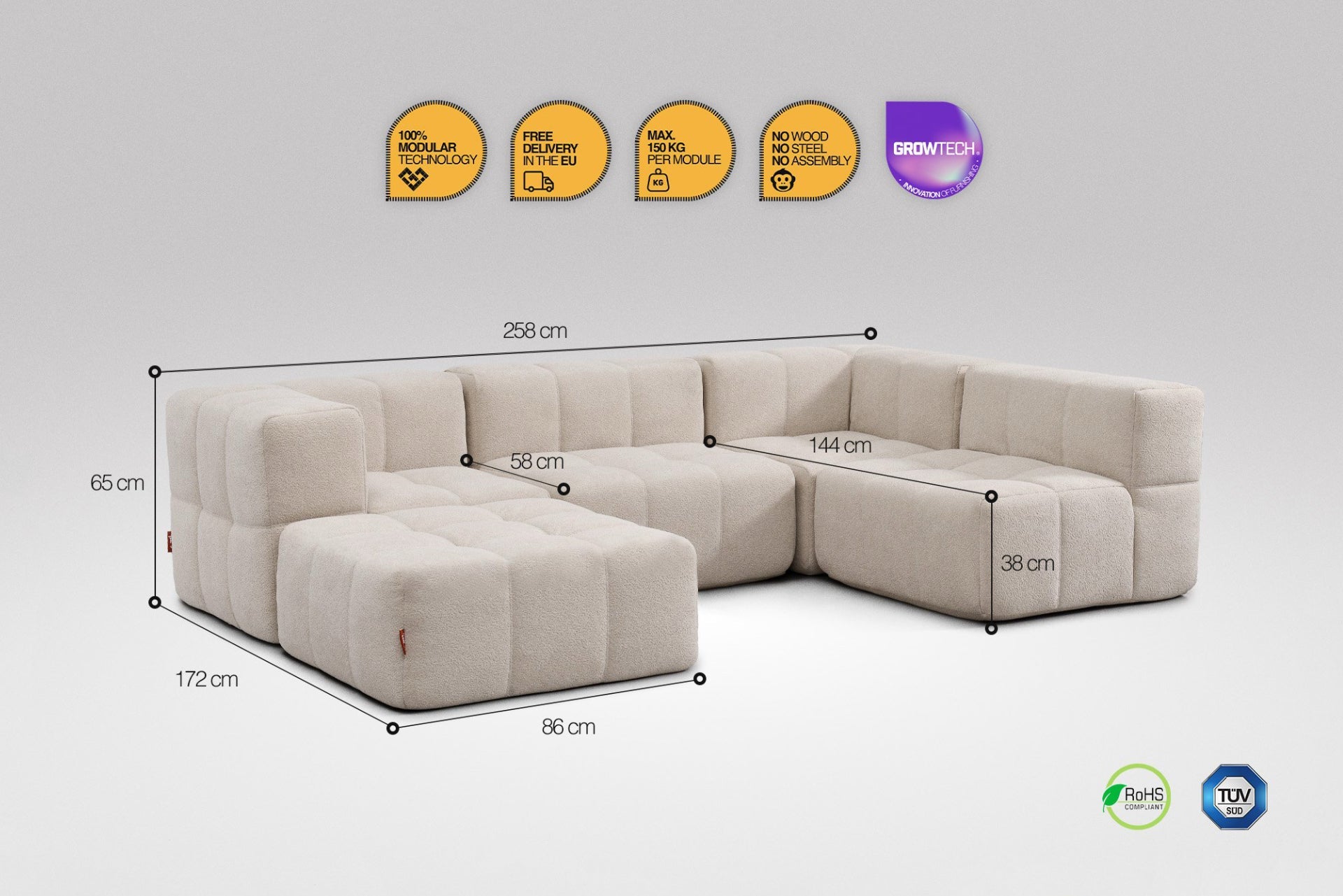 A modulok egyszerűen összekapcsolhatók, így stabilan tartanak egymás mellett – nincs szétcsúszás, csak masszív kényelem. Csúszásgátló felületük és ideális súlyuk gondoskodik róla, hogy a kanapé a helyén maradjon, mégis könnyedén átrendezhesd, ha új hangulatra vágysz.