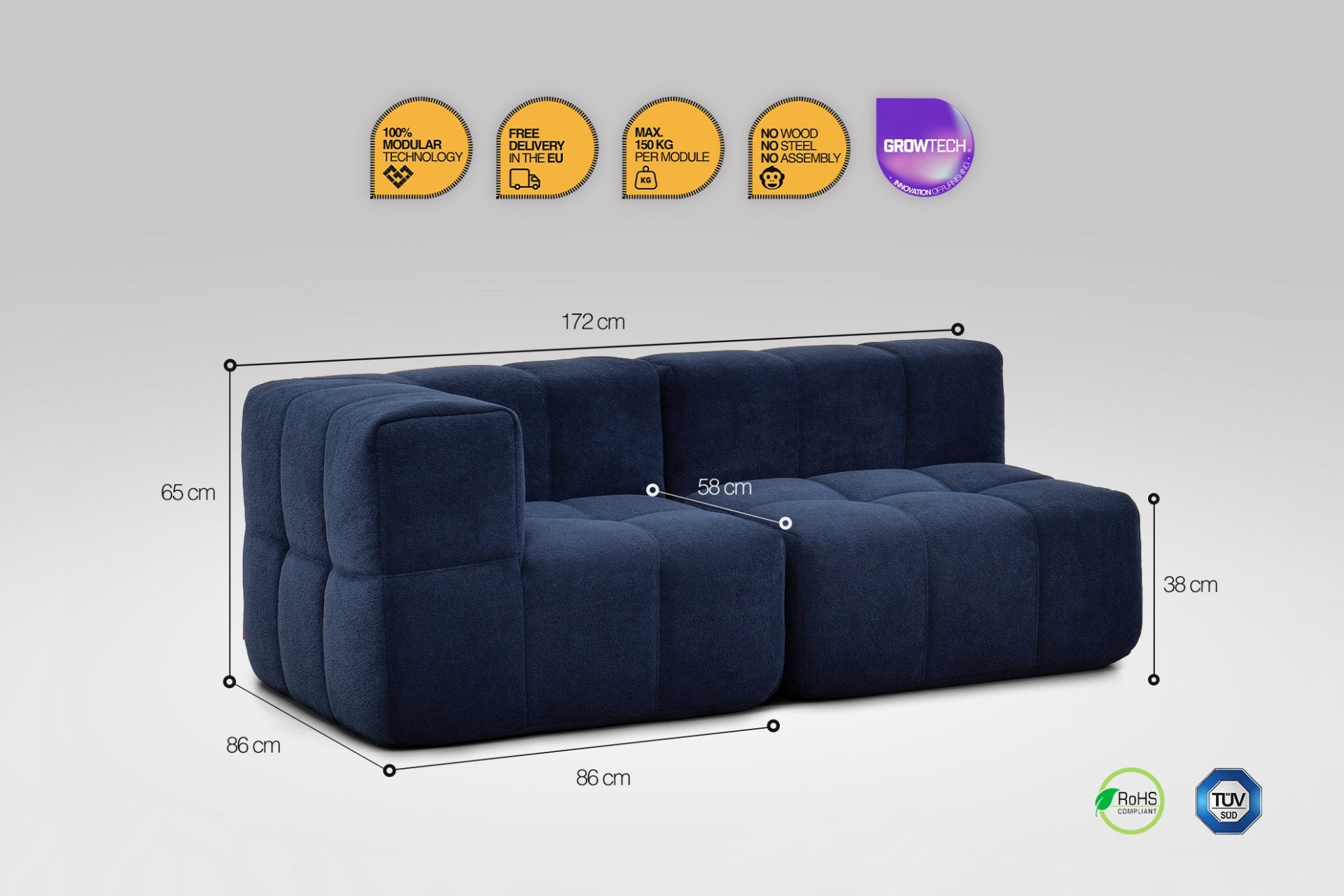 A modulok egyszerűen összekapcsolhatók, így stabilan tartanak egymás mellett – nincs szétcsúszás, csak masszív kényelem. Csúszásgátló felületük és ideális súlyuk gondoskodik róla, hogy a kanapé a helyén maradjon, mégis könnyedén átrendezhesd, ha új hangulatra vágysz.