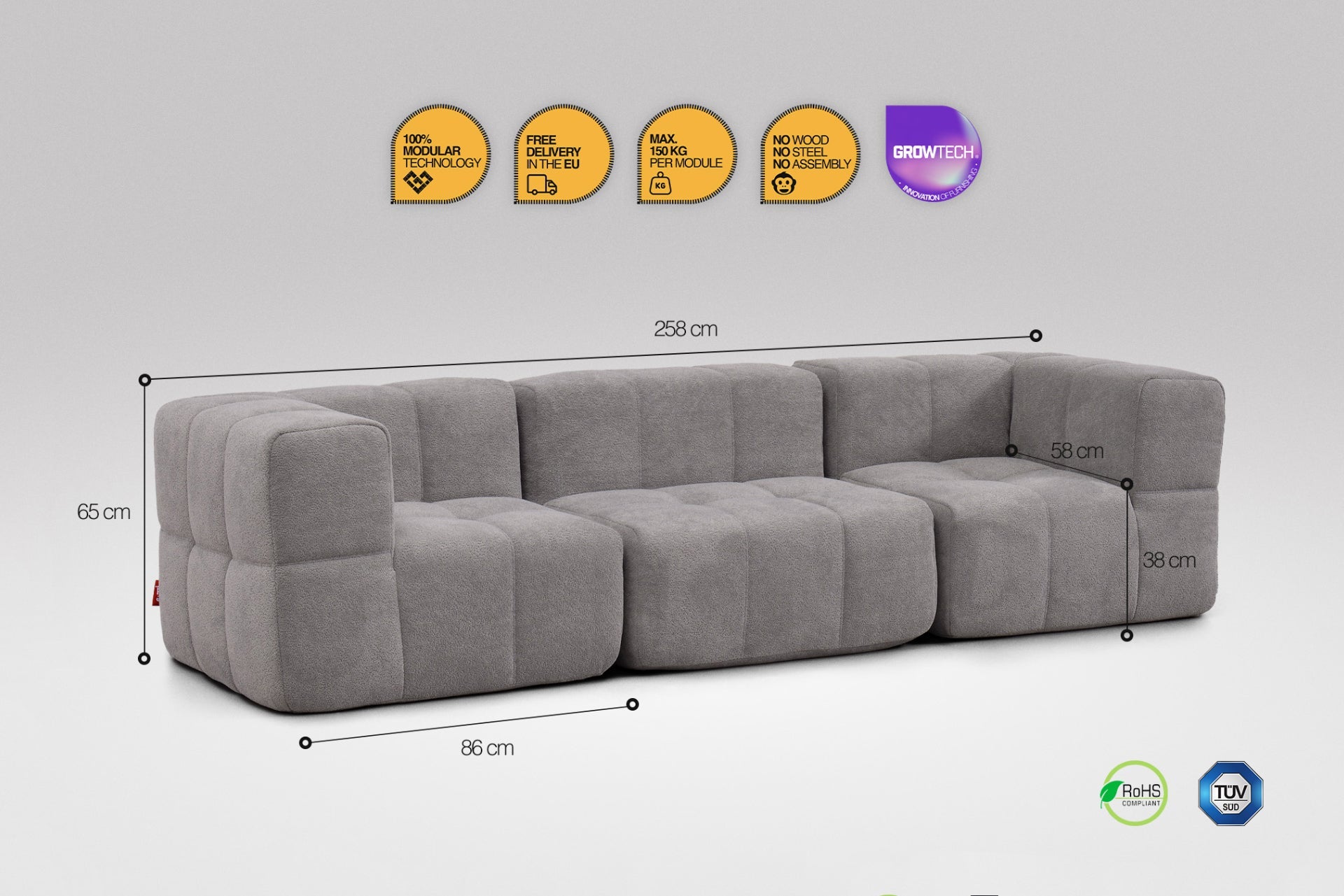A modulok egyszerűen összekapcsolhatók, így stabilan tartanak egymás mellett – nincs szétcsúszás, csak masszív kényelem. Csúszásgátló felületük és ideális súlyuk gondoskodik róla, hogy a kanapé a helyén maradjon, mégis könnyedén átrendezhesd, ha új hangulatra vágysz.