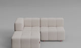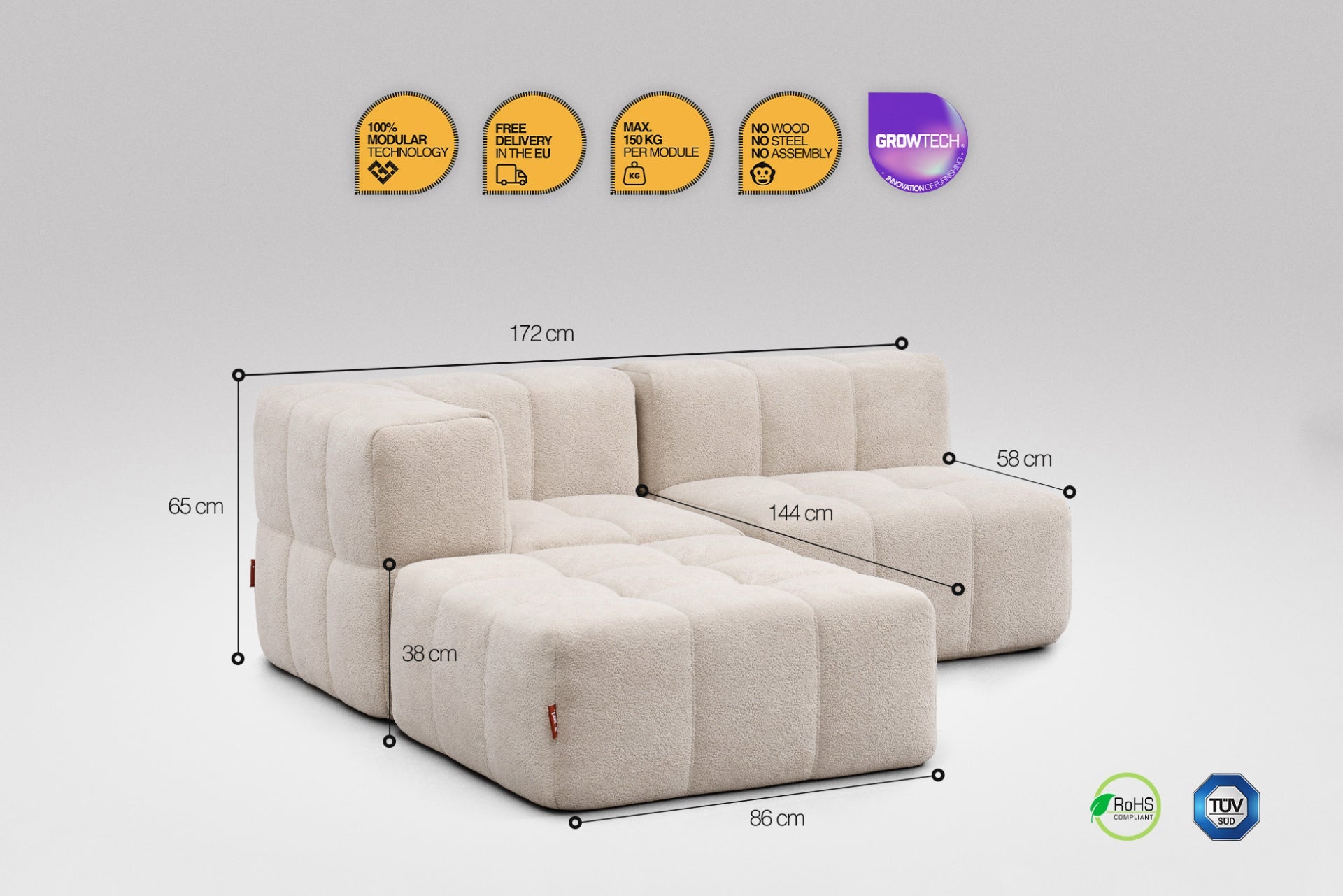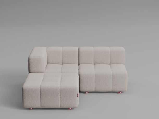 Taburet, středový a rohový díl lze jednoduše postavit vedle sebe – není potřeba žádné upevnění, pohovka díky své váze a konstrukci zůstává stabilně pohromadě.