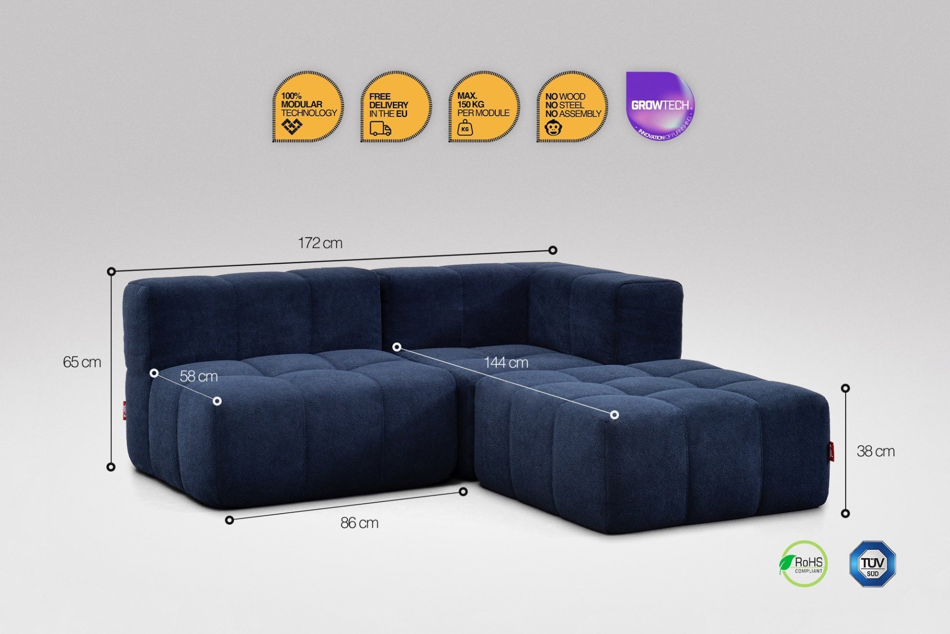 Moduly lze jednoduše propojit, takže drží stabilně vedle sebe – žádné rozjíždění, jen pevné pohodlí.