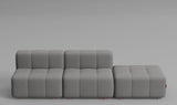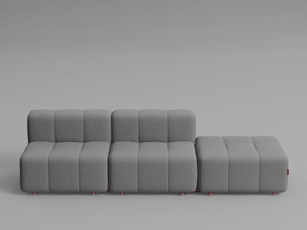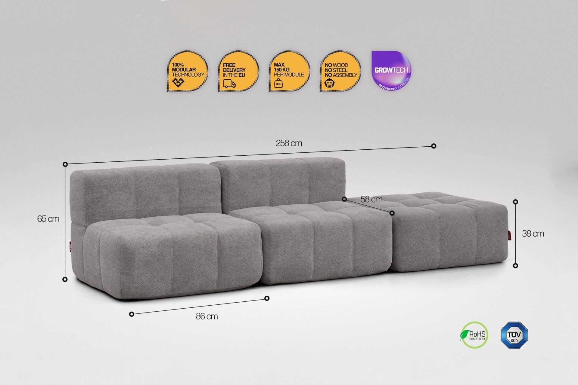 Taburet, středový a rohový díl lze jednoduše postavit vedle sebe – není potřeba žádné upevnění, pohovka díky své váze a konstrukci zůstává stabilně pohromadě.