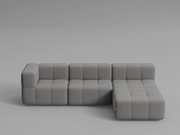 Taburet, středový a rohový díl lze jednoduše postavit vedle sebe – není potřeba žádné upevnění, pohovka díky své váze a konstrukci zůstává stabilně pohromadě.